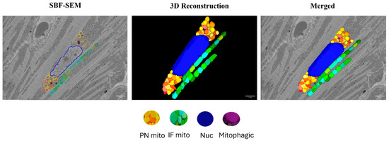 Three-dimensional reconstruction of mitochondrial reticulum in the myocardium from a 4-month-old male rat. Nucleus (blue), PN mitochondria (warm colors), and IF mitochondria (cool colors) were traced in the SBF-SEM images obtained from the left ventricular septum of the myocardium. Purple color indicates mitochondria undergoing mitophagy. Scale bars: 1 µm.