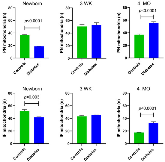 At P1, diabetes-exposed newborn myocardium had 50% fewer PN (p < 0.0001) and 20% fewer IF mitochondria (p = 0.003). By 3 weeks of age, there were no longer exposure-related differences in PN or IF mitochondria count. Interestingly, at the 4-month adult timepoint, diabetes-exposed offspring had a 35% higher number of PN mitochondria (p < 0.0001) and 49% more IF mitochondria (p < 0.0001) compared to control offspring (Figure 3).