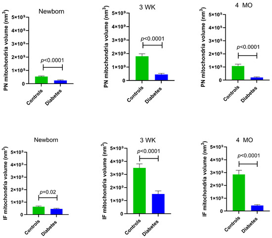 At all developmental timepoints, PN and IF mitochondria volume were significantly lower in diabetes-exposed myocardium compared to the control myocardium (p = 0.02 for newborn IF mitochondria and p < 0.0001 for all others). Of importance, despite having a higher number of mitochondria, 4-month-old adult diabetes-exposed offspring have a significantly lower mitochondria volume compared to control offspring (Figure 4).
