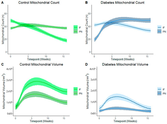 Developmental differences in mitochondrial reticulum in terms of number and volume of mitochondria in control and in diabetes-exposed myocardium in male offspring over time. Local regression fitting by locally estimated scatterplot smoothing (LOESS) was used to compare a moving average over developmental timepoints. Each line represents a regression for either IF or PN, and shaded bands represent a 95% confident interval that the true regression line falls within. Wherever the shaded regions are not touching, there is a significant difference between the bands (p = 0.05) at the point on the x-axis.