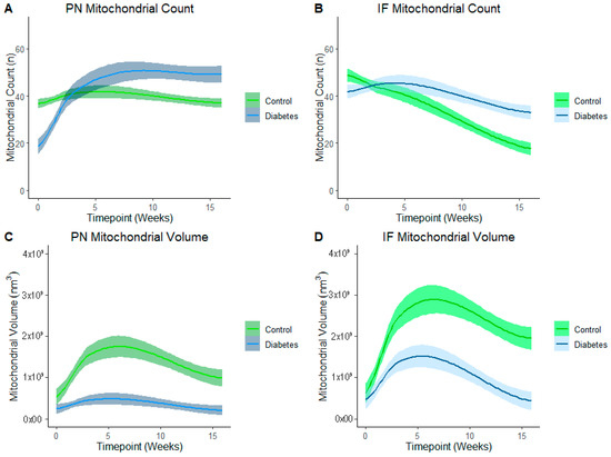 Figure 5 represents PN and IF mitochondrial counts and volume in control (Figure 5A,C) and diabetes-exposed (Figure 5B,D) offspring myocardium across predetermined developmental timepoints. LOESS was used to compare a moving average over developmental timepoints. Each line represents a regression for either PN or for IF mitochondria, and shaded bands represent a 95% confident interval that the true regression line falls within. Wherever the shaded regions are not touching, there is a significant difference between the bands (p = 0.05) at the specified point on the x-axis. At birth, normal (control) myocardium had more IF than PN mitochondria, but the number of IF mitochondria fell as their volume increased over time. Thereafter, IF mitochondria volume was significantly higher than PN volume. This was expected because IF mitochondria normally fuse to form interconnected networks between myofibrils to make up the highly organized mitochondria reticulum, which is a power grid-like arrangement that promotes efficient energy production. Given their varied role in nuclear communication, PN mitochondria counts were lower than IF counts at birth, but both number and volume of PN mitochondria increased after birth to a peak at 3 weeks of age. Thereafter, normal myocardium has higher PN mitochondria counts, but volume remains significantly lower than the network of IF mitochondria.