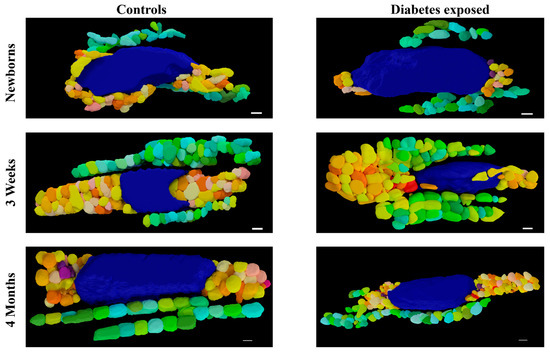 Myocardium from control and diabetes-exposed rats was evaluated at P1 (newborn), 3 week (weaning), and 4 month (adult) developmental timepoints using 1 mm3 sections of the left ventricular septum fixed and prepared for SBF-SEM as previously detailed [9]. Specifically, myocardial samples were fixed in 0.15 M cacodylate buffer containing 2 mM of CaCl2, 2% of glutaraldehyde and 2% of paraformaldyhyde for 24 h. Fixed samples were washed in 0.15 M of cacodylate buffer and incubated at room temperature in 2% of osmium tetroxide in 0.15 M of cacodylate buffer for 1.5 h, followed by another incubation in cacodylate buffer (0.15 M) containing 2.5% of potassium ferracyanide and 2% of osmium tetroxide for another 1.5 h at room temperature. Samples were rinsed with water and incubated in 1% of thiocarbohydrazide for 45 min at 50 °C. After another round of rinsing with water, samples were incubated sequentially in 2% of osmium tetroxide in water for 1.5 h at room temperature, 1% of aqueous uranyl acetate overnight at 4 °C, and in 7% of lead aspartate solution for 1 h at 50 °C with several rinses in water between each reagent. Following dehydration through a series of ethanol and acetone washes, samples were infiltrated and eventually embedded in polyepoxide resin, and Durcapan (EMS, Hatfield, PA, USA), and polymerized in a 60 °C oven for a minimum of 24 h. To prepare embedded samples for placement into the SEM and subsequent imaging, 1 mm3 pieces were roughly trimmed and mounted to 8 mm aluminum stubs using epoxy EPO-Tek (EMS, Hatfield, PA, USA). Then the mounted sample was again trimmed to a 0.5 mm × 0.5 mm × 1 mm tall tower. To assist in charge dissipation, the entire stub along with the trimmed sample was coated with gold palladium. Then the coated samples were inserted into a VolumeScope for SBF-SEM (Thermo Fisher, Waltham, MA, USA) at the Mayo Electron Microscopy Core and allowed to acclimate to high vacuum for 12 h prior to the start of the imaging. Approximately 300 high resolution images/section at 50 nm increments were captured by SBF-SEM in a low-vacuum environment using a beam energy of 3.0 kV with a current of 100 pA and a scanning dwell time of 2 µs and 10 nm pixel size.