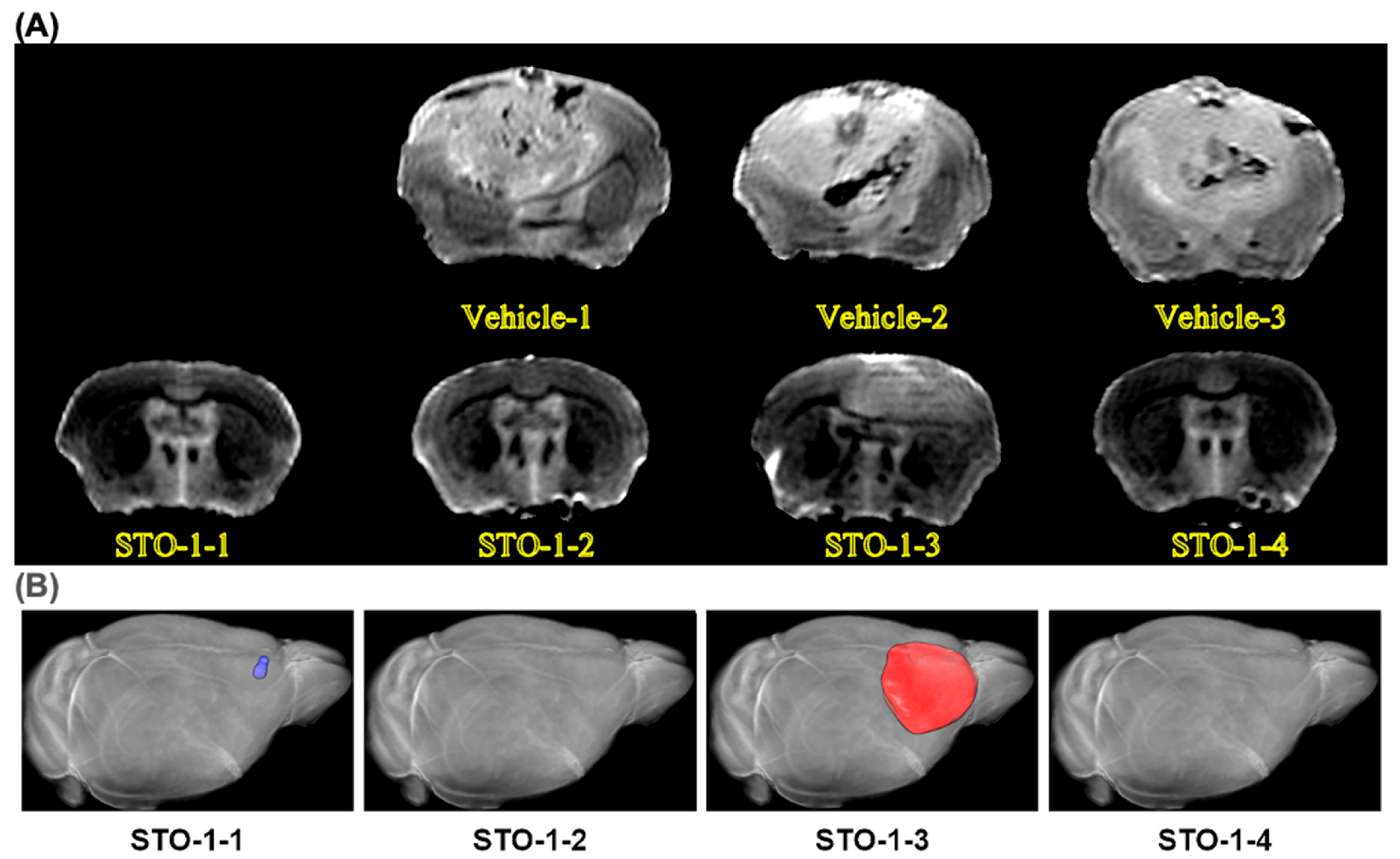 Figure 9C–E). In contrast, MRI scans of STO-1-treated mice 85 days post-implantation showed that three out of four surviving mice were tumor-free, while one mouse exhibited a small residual tumor (