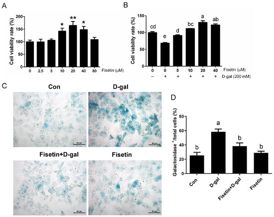 Fisetin inhibits D-gal-induced senescence in SYF-GCs. (A) Effect of different concentrations of fisetin on SYF-GC viability as determined by CCK-8 (n = 6). (B) Effects of fisetin and 200 mM D-gal treatment on SYF-GC proliferation as assessed by the CCK-8 assay. (C,D) Quantification and representative images of SA-β-gal-positive cells among total GCs following the indicated treatments. Scale bar: 50 μm. * p < 0.05, ** p < 0.01 indicate statistically significant difference relative to control, following fisetin treatment of different concentrations for 24 h. Different lowercase letters indicate significant differences (p < 0.05).