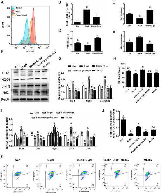The protective effect of fisetin against D-gal-induced oxidative stress in SYF-GCs was mediated by the Nrf2/HO-1 signaling pathway. (A,B) GCs were pretreated with 20 µM fisetin for 24 h and then cultured with 200 mM D-gal for another 24 h. The intracellular ROS production was detected by flow cytometry. (C–E) Antioxidative levels (CAT and T-SOD) and oxidative product (MDA) in the GCs under the indicated treatments. (F,G) WB assay of HO-1, NQO1, p-Nrf2, and Nrf2 in control, D-gal, Fisetin + D-gal, ML385 alone and ML385 + fisetin +D-gal groups. β-actin served as an invariant control for equal loading. (H) Detection of GSH level. (I) The mRNA levels of the SOD, CAT, Mgst, Gsta, Gsr genes in GCs following treatments described in F. (J,K) Detection of MMP in flow cytometry. Different lowercase indicated significant differences (p < 0.05).