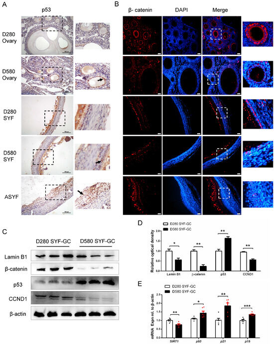 Expression of β-catenin and cell cycle-related proteins in ovarian and follicular tissues of D280 and D580 laying hens. (A) Expression of p53 in ovarian tissues and SYFs from D280 and D580 hens, and ASYFs visualized by IHC. Black arrows represent positive-colored GCs. Scale bar: 100 µm. (B) IF staining for β-catenin in the ovaries, SYFs, and ASYFs from D280 and D580 hens. Scale bar: 50 µm. (C,D) WB analysis of Lamin B1, β-catenin, p53, and CCND1 expression in granulosa cells of SFYs from D280 and D580 hens. (E) The mRNA levels of SIRT1, p53, p21, and p15 were determined by qRT-PCR in GCs isolated from SYFs of D280 and D580 hens. * p < 0.05, ** p < 0.01, *** p < 0.001 represent the differences between SYF-GCs from 280-day-old hens and those from 580-day-old hens.