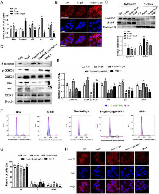 Fisetin alleviated D-gal-induced cell senescence and cell cycle arrest by upregulating β-catenin. (A) The mRNA levels of Axin, β-catenin, p53, p21 and p16 genes in the control, D-gal, Fisetin and D-gal combined treatment groups. (B) IF analysis of β-catenin in control GCs, senescent GCs (D-gal), and senescent GCs upon fisetin treatment (D-gal + Fisetin). Scale bar: 5 µm. (C) GCs were pretreated with 20 µM fisetin for 24 h and then cultured with 200 mM D-gal for another 24 h, the nuclear and cytoplasmic fractions were from GCs and analyzed by Western blotting using the indicated antibodies. (D,E) WB analysis of β-catenin, GSK3β, p-GSK3β, p53, p21 and CDK1 proteins in normal, D-gal, D-gal + Fisetin, D-gal + Fisetin + IWR-1 (β-catenin inhibitor), IWR-1 groups. (F,G) Cell cycle progression of treated GCs was analyzed by flow cytometry. (H) Representative images of Lamin B1 staining in senescent GCs under the indicated treatment conditions. Scale bar: 5 µm. Different lowercase letters indicate significant differences (p < 0.05).