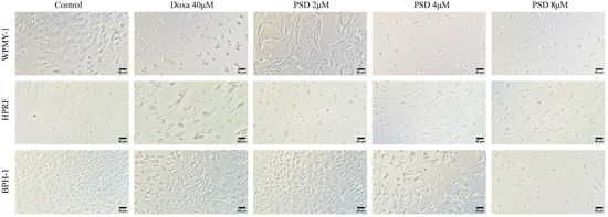 Cells were seeded in 96-well plates at a density of 4000 cells per well for WPMY-1, HPRF, and BPH-1 cell lines, respectively. The cells were then exposed to PSD (2–8 μM) or doxazosin (40 μM). After 48 h of treatment, cell morphology was observed and photographed under a microscope.