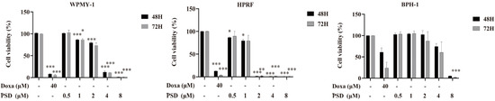The inhibitory effects of PSD on the growth of WPMY-1, HPRF, and BPH-1 cells were evaluated using the CCK-8 assay. As shown in Figure 3, treatment with 1–8 μM PSD for 48 h significantly inhibited the viability of WPMY-1 cells, while PSD at concentrations ranging from 500 nM to 8 μM markedly suppressed the growth of HPRF cells. After 72 h of treatment, 8 μM PSD significantly reduced the viability of BPH-1 cells. In summary, PSD suppressed the growth of all three cell lines in a dose- and time-dependent manner.