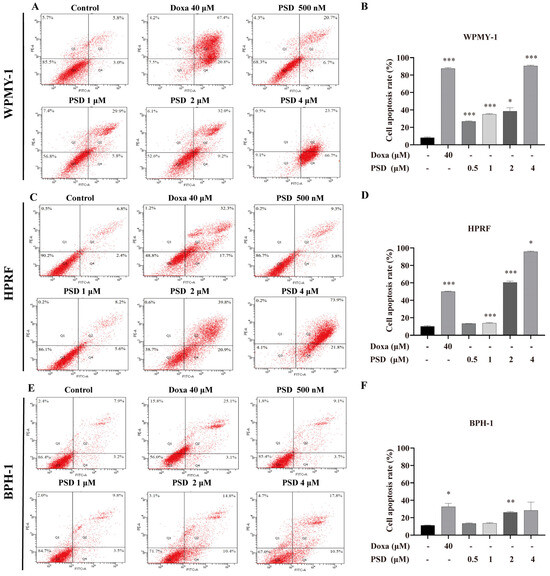 To further investigate the effect of PSD on prostate cells, apoptosis was assessed using Annexin V-FITC/PI staining followed by flow cytometry. The results showed that treatment with PSD at concentrations ranging from 500 nM to 4 μM significantly increased the apoptosis rate in WPMY-1 cells (Figure 4A,B). Similarly, exposure to 1–4 μM PSD induced a significant increase in apoptosis in HPRF cells (Figure 4C,D). Furthermore, 4 μM PSD demonstrated a stronger pro-apoptotic effect than 40 μM doxazosin in both WPMY-1 and HPRF cells. In BPH-1 cells, significant apoptosis induction was observed following treatment with 2 μM PSD (Figure 4E,F).
