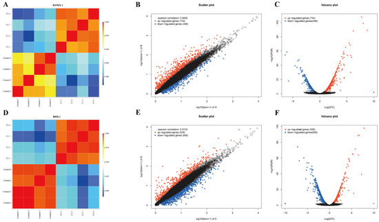 Transcriptomic analysis of WPMY-1 and BPH-1 cells following PSD treatment. (A) Sample correlation heatmap of the WPMY-1 cell line. (B) Scatter plot of DEGs in WPMY-1 cells. (C) Volcano plot displaying DEGs in WPMY-1 cells. (D) Sample correlation heatmap of the BPH-1 cell line. (E) Scatter plot of differentially expressed genes in BPH-1 cells. (F) Volcano plot displaying DEGs in BPH-1 cells.