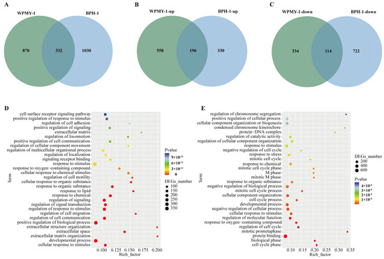 Common differentially expressed genes following PSD treatment. (A) Venn diagram of common DEGs shared between WPMY-1 and BPH-1 cells. (B) Common up-regulated DEGs. (C) Common down-regulated DEGs. (D) Gene Ontology (GO) enrichment analysis of DEGs in WPMY-1 cells. (E) GO enrichment analysis of DEGs in BPH-1 cells.