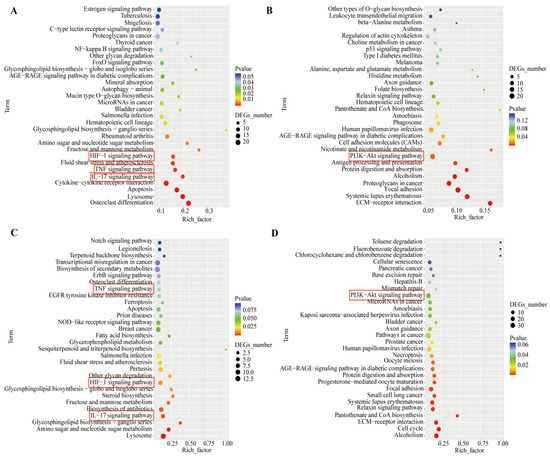 PSD modulates gene expression associated with benign prostatic hyperplasia (BPH). (A) KEGG pathway enrichment analysis of significantly up-regulated genes in WPMY-1 cells. (B) KEGG pathway enrichment analysis of significantly down-regulated genes in WPMY-1 cells. (C) KEGG pathway enrichment analysis of significantly up-regulated genes in BPH-1 cells. (D) KEGG pathway enrichment analysis of significantly down-regulated genes in BPH-1 cells.
