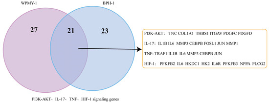 Shared differentially expressed genes in the PI3K/AKT, IL-17, TNF, and HIF-1 signaling pathways between WPMY-1 and BPH-1 cells.