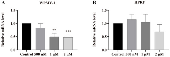 AR Gene Expression Detected by RT-qPCR. (A) AR gene expression levels in WPMY-1 cells. (B) AR gene expression levels in BPH-1 cells. Data are presented as the mean ± standard deviation (SD) from three independent experiments (n = 3). ** p < 0.01, *** p < 0.001 versus the respective control group.