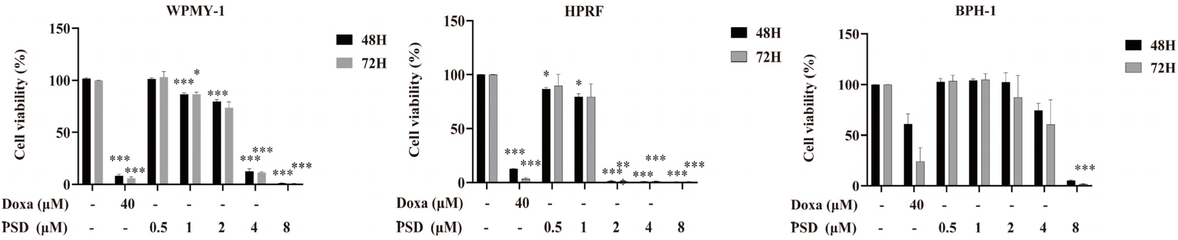 3.2. PSD Inhibits the Growth of WPMY-1, HPRF, and BPH-1 Cells