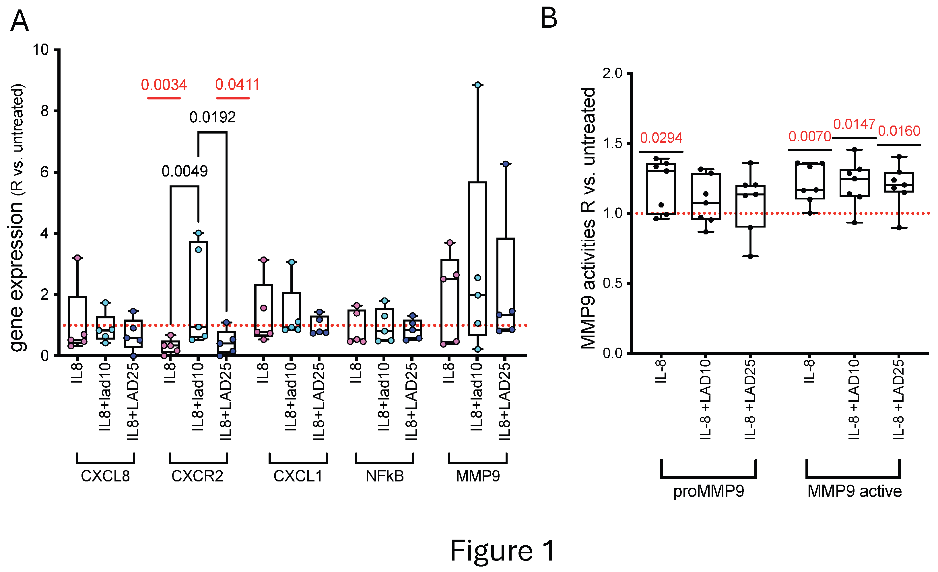 3.1. Primary HAOEC Conditioned with IL-8 and Treated with Lad: Gene Expression and MMP9 Activities