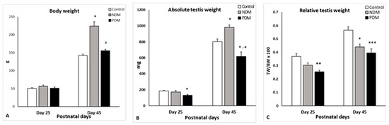 Body weight ((A); g), absolute testis weight ((B); mg) and relative testis weight [(C); testis weight (TW) to body weight (BW) ratio] on days 25 and 45 of the control and diabetic rats. Data represent the mean value ± standard error (SE); * p < 0.05; ** p < 0.01; *** p < 0.001—statistical significance compared to the control value; a—statistically significant difference compared to NDM. NDM—neonatally-induced diabetes; PDM—prepubertally-induced diabetes.