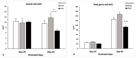 Absolute nuclear volume (ANV, mm3) of Sertoli cells (A) and total germ cells (B) on day 25 and day 45 of control and diabetic rats. Data represent the mean value ± standard error (SE); * p < 0.05—statistical significance compared to the control value; a—statistically significant difference compared to NDM. NDM—neonatally-induced diabetes; PDM—prepubertally-induced diabetes.
