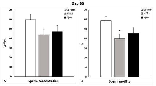 Sperm concentration (106/mL, (A)) and motility (%, (B)) of 65-day-old control and diabetic rats. Data represent the mean value ± standard error (SE); * p < 0.05—statistical significance compared to the control value. NDM—neonatally-induced diabetes; PDM—prepubertally-induced diabetes.