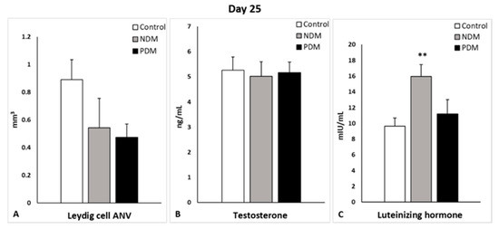 Absolute nuclear volume (ANV) of Leydig cells (mm3) (A), serum testosterone levels (ng/mL) (B), and serum luteinizing hormone (mlU/mL) (C) on day 25 of control and diabetic rats. ** p < 0.01—statistical significance compared to the control value. NDM—neonatally-induced diabetes; PDM—prepubertally-induced diabetes.