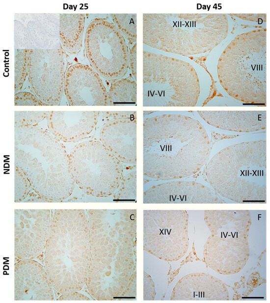 Immunohistochemical expression of androgen receptor (AR) in Sertoli cells in 25- and 45-day-old control (A,D) and rats with neonatal DM (B,E) and prepubertal DM (C,F). A weaker intensity of reaction was observed in Sertoli cells of PDM rats. Note the uniform intensity of the reaction in Sertoli cells of PDM rats aged 25 and 45 days. Scale bar = 50 µm. Negative control was carried out by pre-absorption of the primary antibody with peptide immunogen (picture inserted into the control picture of day 25).