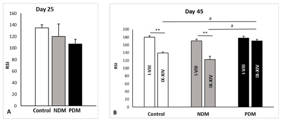 Measurement of androgen receptor (AR) immunostaining in Sertoli cell nuclei of 25- (A) and 45-day-old (B) rat testes using ImageJ. On day 45, the intensity of AR immunostaining is presented for stages I–VIII and late stages (IX–XIV) for each experimental group. The values in graphs are shown as reciprocal staining intensity (RSI), where RSI = 255—mean gray value. Data represent the mean value ± standard error (SE); ** p < 0.01—statistical significance compared to the control value. a—statistical significance between groups. NDM—neonatally-induced diabetes; PDM—prepubertally-induced diabetes.