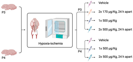 Schematic diagram of ExAc different dosing treatment regimens following hypoxia-ischemia either at P3 or P4. Created in BioRender. Rocha Ferreira, E. (2025) https://BioRender.com/i9yz99f (accessed on 19 August 2025).