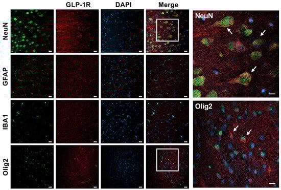 Immunofluorescence colocalization with different neural cells showed that the GLP-1R is present in neurons and to a lesser extent in oligodendrocytes, but not in astroglia or microglia (Figure 3).