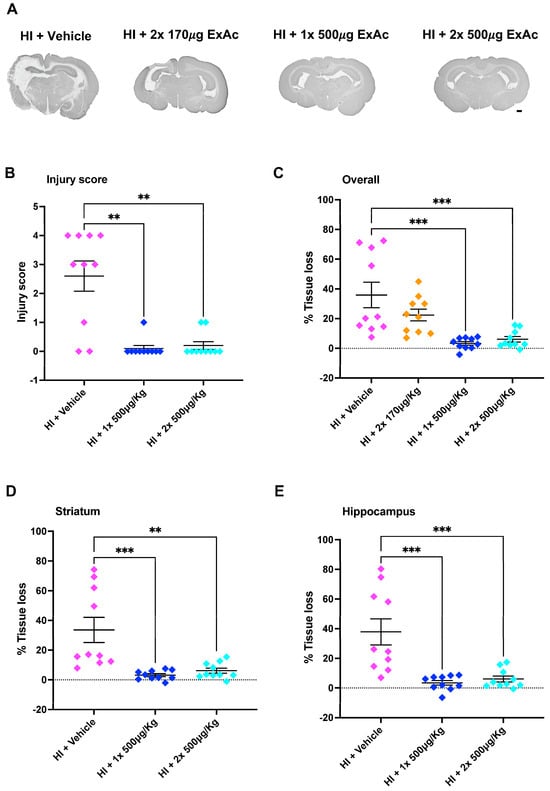 ExAc is neuroprotective following hypoxia-ischemia at P3. (A) Whole brain representative micrographs of hypoxia-ischemia plus vehicle control (n = 10) at two administrations of 170 μg/kg 24 h apart (n = 10), a single administration of 500 μg/kg (n = 10) or a double administration of 500 μg/kg 24 h apart (n = 10). (B) Macroscopic injury score. (C) Overall (D) striatum, and (E) hippocampus level tissue loss measurements. Data presented as individual animals or mean ± SEM and analyzed using Kruskal-Wallis, Dunn’s test (injury score), or one-way ANOVA followed by Tukey’s multiple comparisons test. ** p < 0.01 and *** p < 0.001. Scale bar = 2 mm.