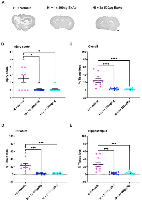ExAc remains neuroprotective following hypoxia-ischemia at P4. (A) Whole brain representative micrographs of hypoxia-ischemia plus vehicle control (n = 10) at single administration of 500 μg/kg (n = 10) or double administration of 500 μg/kg 24 h apart (n = 10). (B) Macroscopic injury score. (C) Overall (D) striatum and (E) hippocampus level tissue loss measurements. Data presented as individual animals or mean ± SEM and analyzed using Kruskal-Wallis, Dunn’s test (injury score), or one-way ANOVA followed by Tukey’s multiple comparisons test. * p < 0.05, *** p < 0.001 and **** p < 0.0001. Scale bar = 2 mm.