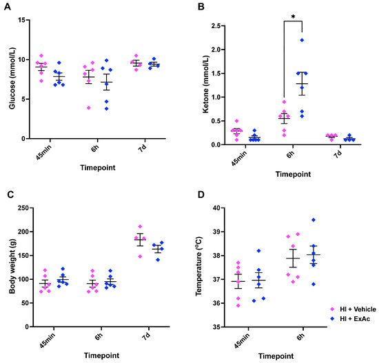 ExAc administration physiological analysis. (A) Blood glucose, (B) blood ketone bodies, (C) body weight, and (D) rectal temperature measurements at different time-points. N numbers consisted of hypoxia-ischemia + vehicle (n = 6) or 1× 500 μg/kg ExAc (n = 6). Data presented as individual animals ± SEM and analyzed using Mann–Whitney test. * p < 0.05.