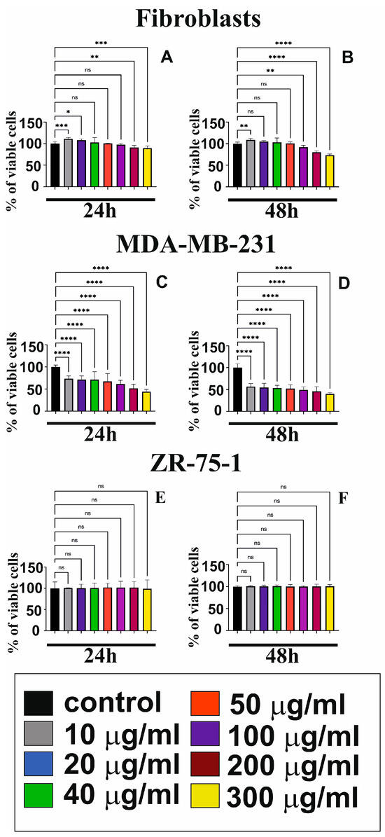 The cytotoxicity effects of GO (10 to 300 μg/mL) on human skin fibroblasts (A,B), MDA-MB-231 (C,D), and ZR-75-1 (E,F) for different treatment periods (24 h and 48 h). Mean values from three independent experiments ± SD are presented. Significant alterations are expressed relative to the controls and marked with asterisks. * p = 0.0197, ** p = 0.004, *** p = 0.0003, **** p < 0.0001, ns—not statistically significant.