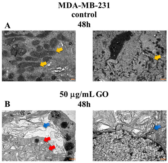 TEM analysis results of the interaction of GO with MDA-MB-231 cells. Morphological changes appeared in the MDA-MB-231 cells. The MDA-MB-231 cell lines were incubated with 50 μg/mL GO for 48 h. Control cells (A): The cytoplasm contained small oval or rod-shaped mitochondria with a medium-electron-dense matrix (yellow arrow). Treatment cells (B): Mitochondria varied in size and shape and were slightly larger than in the control group. They often exhibited focal swelling and destruction of mitochondrial cristae, or segmental and sometimes complete effacement of the limiting membranes and/or mitochondrial cristae (red arrow). Some cells had mitochondria with a thickened matrix, but in some cases, segmental effacement of the limiting membranes was also observed. Blue arrows: GO fibrils. Magnification ×50,000 and ×15,000 (Panel (A)), magnification ×15,000 and ×30,000 (Panel (B)). Scale bar: 200 nm or 1 μm (Panel (A)), and 1 μm or 500 nm (Panel (B)).
