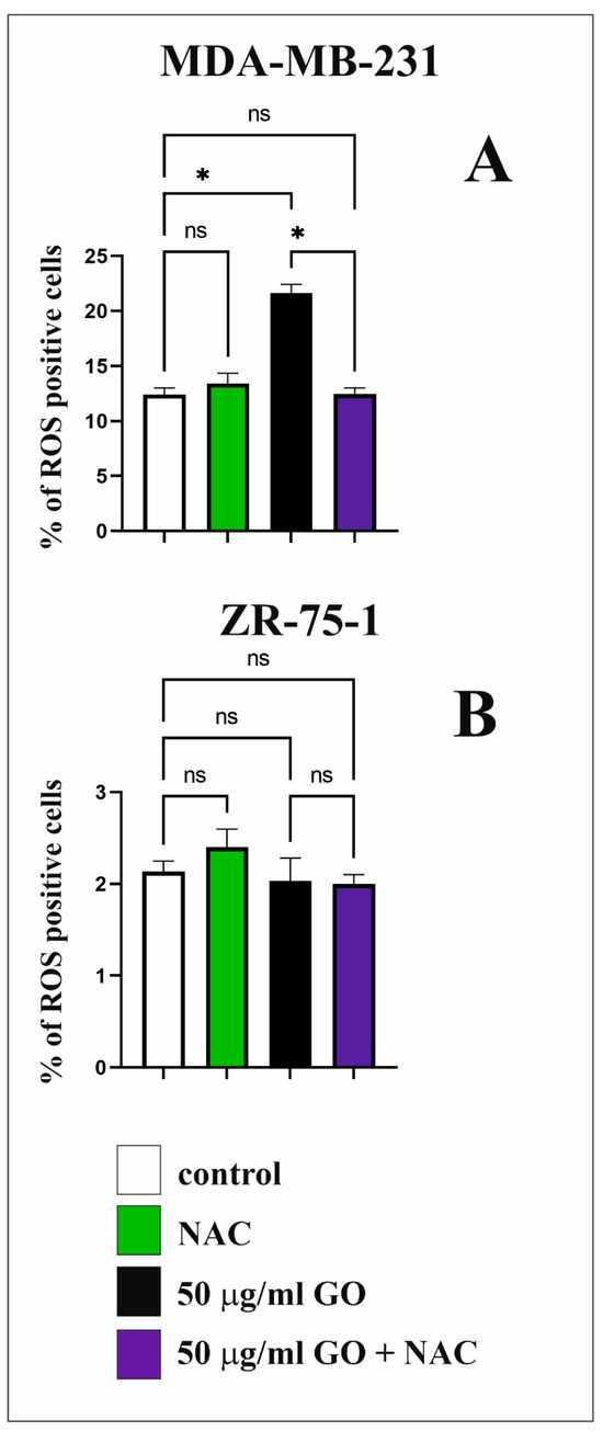 ROS production induced by GO in MDA-MB-231 (A) and ZR-75-1 cells (B). The breast cancer cells were incubated with 50 μg/mL of GO for 48 h. Significant differences compared to the adequate control group. * p < 0.0001, ns—not statistically significant.