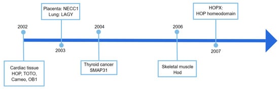 Since then, this homeodomain protein has been designated HOPX. The timeline of HOPX identification in different tissues is illustrated in Figure 1.