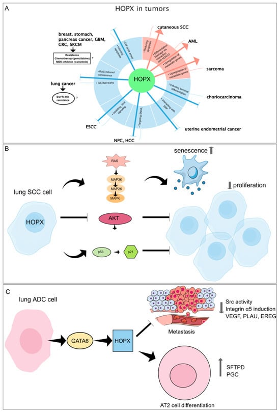 The roles of HOPX in various types of tumors and its mechanisms of action in lung cancer cells. (A) The tumor-suppressive function (highlighted in blue) and the oncogenic function (highlighted in red) of HOPX in tumors. The association between HOPX and clinical sensitivity to anticancer drugs in SKCM and lung cancer is indicated. The mechanisms of action of HOPX in (B) lung squamous cell carcinoma (SCC) cells and (C) lung adenocarcinoma cells. HOPX inhibited SCC cell proliferation by increasing Ras-induced cellular senescence, inactivating the AKT pathway, and enhancing the p53/p21 activity. HOPX interacting with GATA6 inhibits the ADC cell metastasis and promotes alveolar type II (AT2) cell differentiation, accompanied by downregulation of metastasis-associated genes and upregulation of lung differentiation-associated genes. GBM: glioblastoma multiforme; CRC: colorectal cancer; SKCM: skin cutaneous melanoma; ESCC: esophageal squamous cell carcinoma; NPC: nasopharyngeal carcinoma; HCC: hepatocellular carcinoma; AML: acute myeloid leukemia; MEK: mitogen-activated protein kinase kinase; EGFR-TKI: epidermal growth factor receptor (EGFR)–tyrosine kinase inhibitor; ADC: adenocarcinoma.