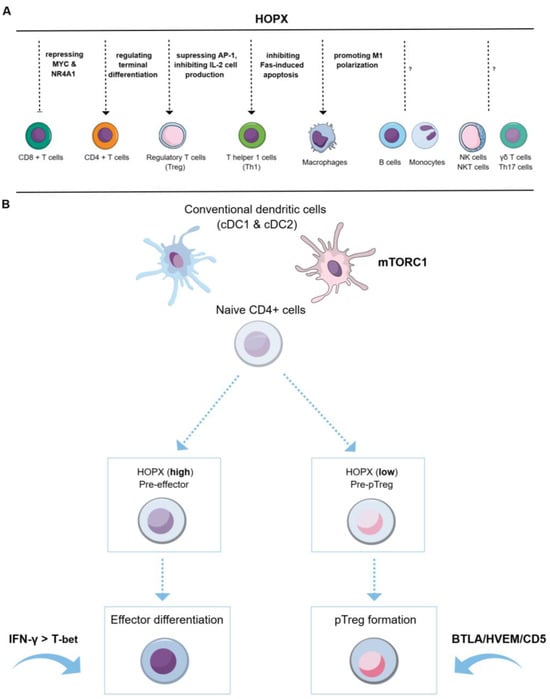 In immune cells, the early induction of Hopx is associated with the transition from naïve T cells to specialized CD4+ T cells, and the early expression of Hopx implies the onset of immune effector processes, including antigen-specific activation and cytokine-driven polarization [98]. Based on the distinct expression levels of Hopx, activated T cells can be split into two types: Hopx-overexpressing “pre-effectors” and Hopx-underexpressing potential Treg cells. Hopx-overexpressing “pre-effectors” emerged under a homeostatic state can differentiate into autoimmune effector T cells, which participate in autoimmune responses and tumor immunosurveillance [99,100], while Hopx-underexpressing potential Treg cells will convert into terminal pTreg cells [98,100]. Opejin et al. [100] found that the induction of Hopx-overexpressing effector precursors could be promoted by the mammalian target of rapamycin complex 1 (mTORC1) and type 2 dendritic cells (cDC2). In this process, programmed production of interferon-gamma (IFN-γ) and expression of the transcription factor T-bet promoted by IFN-γ are involved. The terminal pTreg conversion can be mediated by cDC1 and cDC2, and for the cDC1-specific pTreg conversion, the function of B and T lymphocyte associated/herpesvirus entry mediator/CD5 (BTLA/HVEM/CD5) axis is important [100]. BTLA recruits HVEM expressed in CD4+ T cells and increases CD5 expression in CD4+ T cells to stimulate pTreg cell conversion [98,100]. The role of HOPX in CD4+ T cell fate determination is illustrated in Figure 3B.