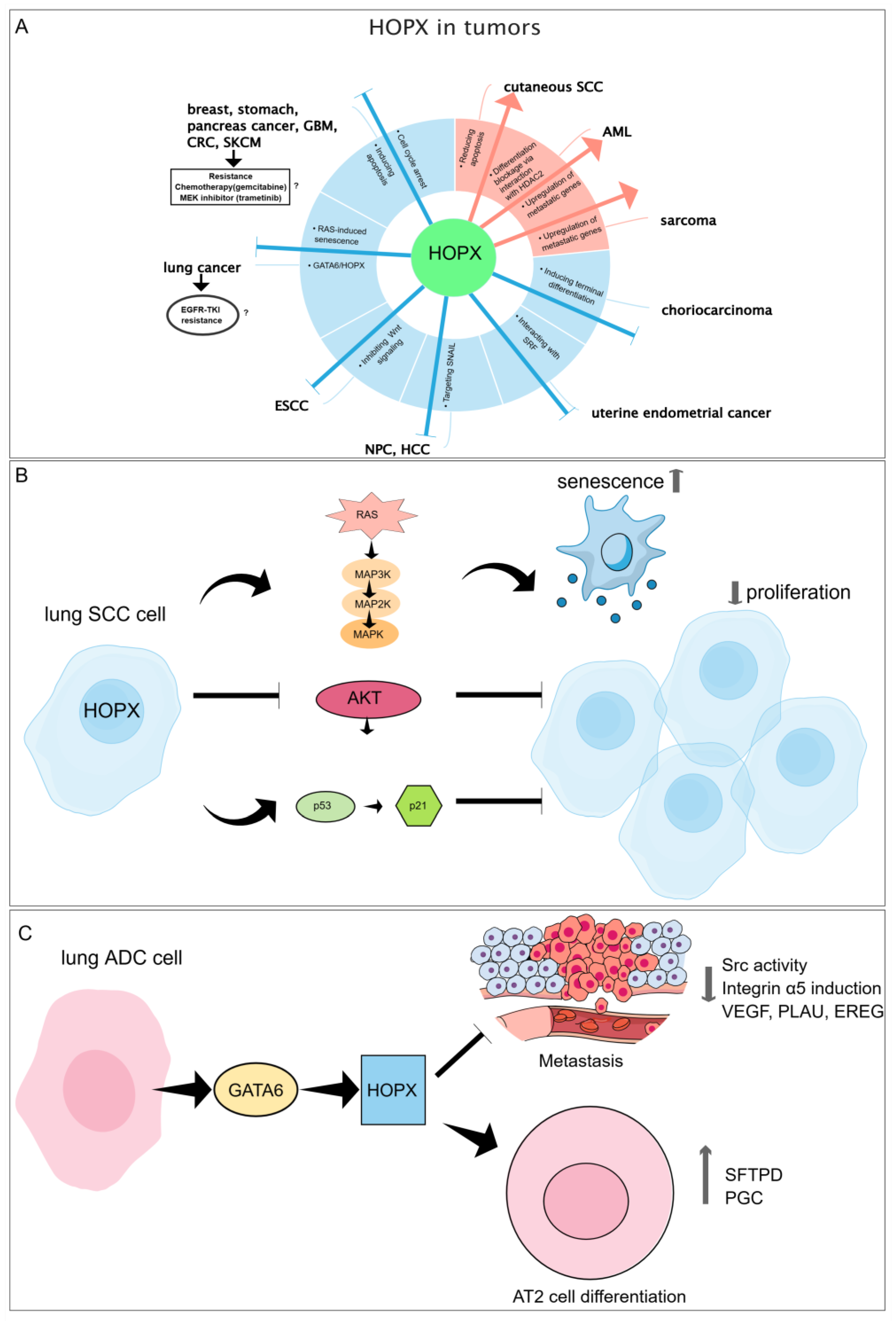 - Caspa Gokulan, R.; Yap, L.F.; Paterson, I.C. HOPX: A Unique Homeodomain Protein in Development and Tumor Suppression. Cancers 2022, 14, 2764. [Google Scholar] [CrossRef]