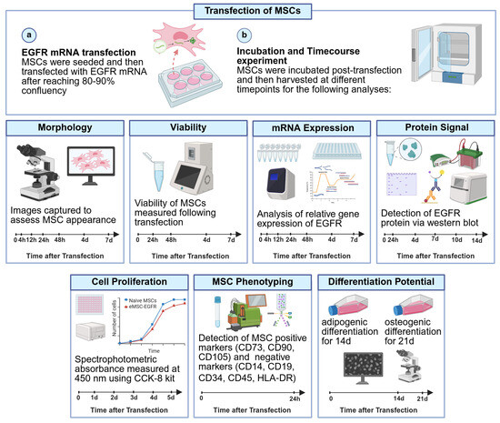 Schematic workflow of transfection of MSCs with EGFR. MSCs were transfected with EGFR mRNA and then the feasibility, efficiency, and stability of EGFR mRNA transfection into MSCs were analyzed via microscopy, qRT-PCR, immunoblotting, flow cytometry, cell proliferation assays and differentiation assays. (a) EGFR mRNA transfection (b) Incubation and time course experiment. Timeline added for each experiment with timepoints when data was collected. Created in BioRender. Ghani, F. (2025) https://BioRender.com/38y2614 (accessed on 10 July 2025).