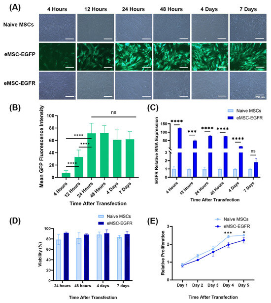 Evaluation of EGFR mRNA delivery feasibility and its stability within MSCs over time and expression of EGFR protein. (A) Representative images of naïve MSCs, eMSC-EGFP and eMSC-EGFR 4 h, 12 h, 24 h, 48 h, 4 d and 7 d after transfection. Scale bar: 250 µm. (B) Fluorescent intensities were measured in thirteen randomly selected cells and fields for background per image for each timepoint after transfection in eMSCs-EGFP. Mean background signal was subtracted from each mean fluorescence value. Quantification of green fluorescence intensity was performed using ImageJ Software. Statistical analysis was performed using unpaired with unequal variance, two-tailed Student’s t-test. (C) Quantification of EGFR RNA in eMSC-EGFR (n = 3). The EGFR mRNA level in naïve MSCs and eMSC-EGFR was detected after 4 h, 12 h, 24 h, 48 h, 4 days and 7 days of transfection. EGFR mRNA in eMSC-EGFR declined as time progressed. (D) Viability measures (n = 3). (E) Cell proliferation assay with data normalized to Day 1 at 450 nm. The proliferative capacity of MSCs was assessed by CCK-8 assay (n = 3). Data are presented as mean ± SD (standard deviation). * p < 0.05, *** p < 0.001, **** p < 0.0001 and ns indicates not significant.
