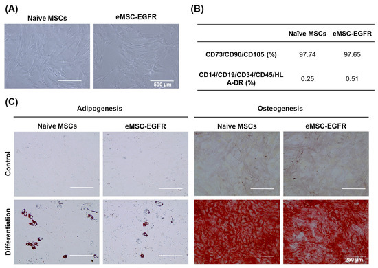 To characterize eMSC-EGFR, their MSC identity was evaluated through morphological assessment, the flow cytometric analysis and functional differentiation assays toward adipogenic and osteogenic lineages. Following the phenotypic guidelines established by the International Society for Cell & Gene Therapy (ISCT) [15], eMSC-EGFR preserved their spindle or fibroblast-like adherent cell characteristics when compared to naïve MSCs (Figure 4A). Flow cytometry was used to confirm the expression of CD105, CD73 and CD90 and absence of CD45, CD34, CD19, CD14 and HLA-DR in MSCs (Figure 4B, Supplementary Figure S1). Additionally, eMSC-EGFR retained their ability to differentiate into adipogenic and osteogenic lineages (Figure 4C).