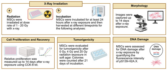Schematic diagram of techniques used to assess MSCs following irradiation with X-ray. (a) Naïve MSCs and eMSC-EGFR were irradiated with X-ray at various dose rates and then (b) assessed for MSC characteristics including morphology, cell proliferation, tumorigenic potential and DNA damage. Created in BioRender. Ghani, F. (2025) https://BioRender.com/8ydwomy (accessed on 10 July 2025).