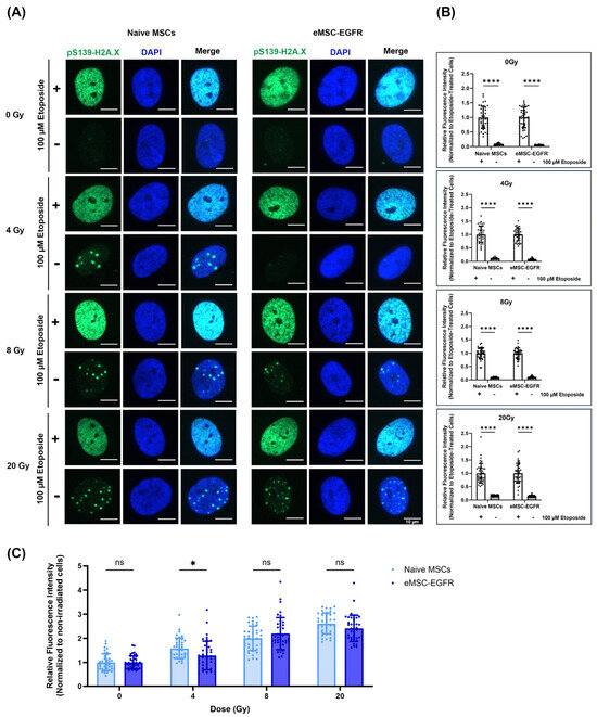 Evaluation of irradiated MSCs for DNA damage. (A) Representative images of bone marrow-derived mesenchymal stem cells (5000 cells/well) seeded to ibidi µ-Slide 8 Well demonstrating naïve MSCs and engineered MSCs overexpressing EGFR. Cells were exposed to X-ray as indicated, fixed, and subjected to immunofluorescence analysis to visualize pS139-H2A.X. In each group, cells were stimulated with 100 µM etoposide to serve as positive control of DNA damage. Scale bar: 10 µm (B,C) Quantification of the fluorescence intensity of pS139-H2A.X (n = 40 cells). Analysis was conducted using the ImageJ Software where the mean fluorescence intensity within each cell was measured followed by background subtraction, averaging, then normalization against the average measured from the non-irradiated cells or etoposide-treated cells. Forty cells were quantified for each sample. Data are presented as mean ± SD. (B) Fluorescence intensities were normalized to the etoposide-treated group for each experimental condition. **** p < 0.0001 was determined by two-way ANOVA, assessing the differences between the mean of the etoposide-treated cells and non-treated cells at each exposure group. (C) Fluorescence intensities at each X-ray exposure group and MSC condition were normalized to non-irradiated cells (0 Gy) within that same group. * p < 0.05 determined by parametric t-test (unpaired, two-tailed) with Welch’s correction while ns indicates not significant.