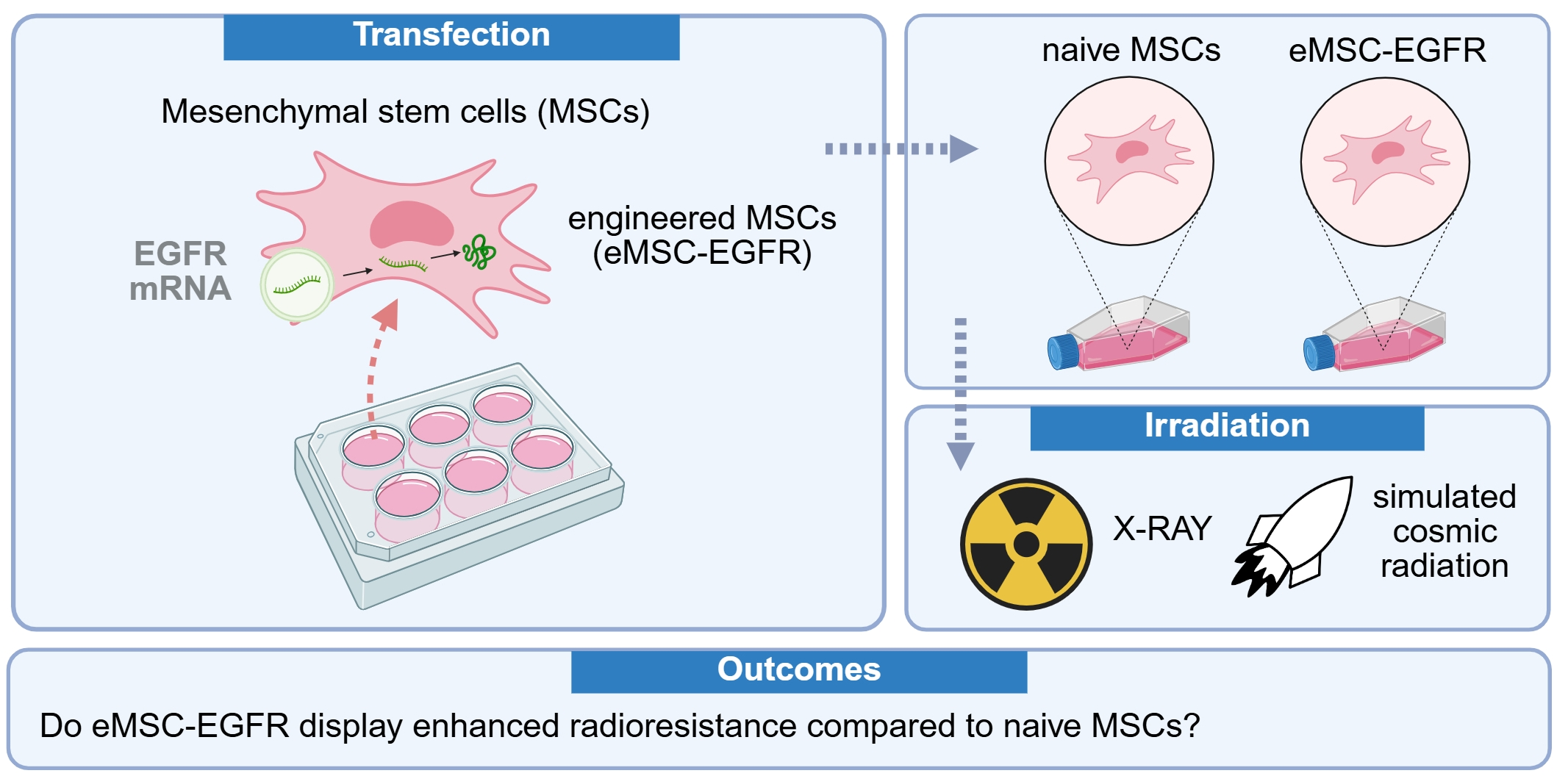 Future experiments using particle accelerators or space analog facilities like the NASA Space Radiation Laboratory will be essential to evaluate the combined impact of mRNA transfection and simulated space radiation on MSC viability, differentiation, and therapeutic potential. Also, it is worth investigating the radioprotection of EGFR in engineered MSCs when exposed to other radiation types like gamma rays and ultraviolet (UV).