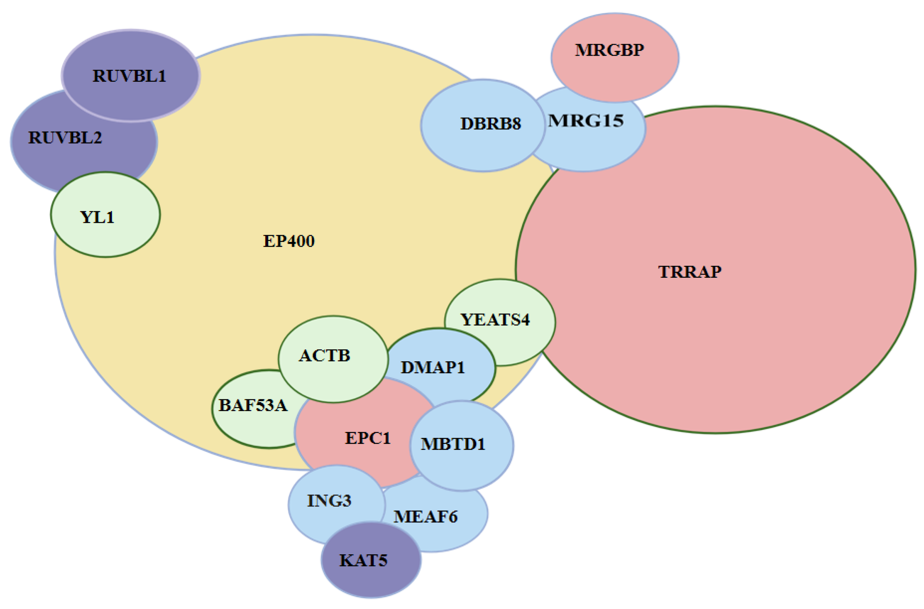 | EP400 | E1A Binding Protein p400 | p400 | ATP-dependent remodeler and central scaffold; histone variant exchange |