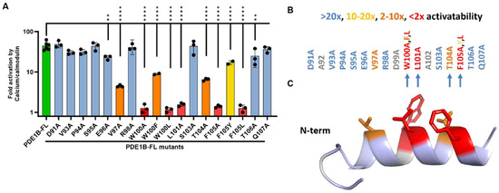 Alanine scan of the PDE1B inhibitory domain identifies key amino acids. (A) Activation by 50 nM calmodulin and 50 µM CaCl2 of full-length PDE1B (PDE1B-FL) with mutations of individual amino acids from the inhibitory domain compared to wild-type PDE1B-FL. Values are presented as means ± SEM from 3–5 independent experiments; significance was determined using one-way ANOVA with Dunnett’s multiple comparisons correction on log-transformed data. ** p < 0.01, and **** p < 0.0001. (B) Overview of the impact of inhibitory domain mutations on the calcium/calmodulin activation potential of PDE1B. The four amino acids that align with the amino acids required for PDE4 regulation are marked with arrows. (C) PEP-FOLD3 [25] predicted structure of the PDE1B inhibitory domain with the five key amino acids highlighted. Unmutated PDE1B-FL is shown in green. Substitutions that abolished activation (<2× activatability) in red, large effect substitutions (2–10× activatability) in orange, medium (10–20×) activatability in yellow, and minimal-no effect (>20× activatability) mutants in blue. Mutations of amino acids in grey were not tested (A92 and A102 were already alanines, and there was too low expression of D99A).