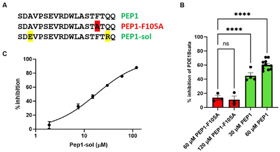 Inhibition of the PDE1B catalytic domain by the inhibitory domain peptide added in trans. (A) Sequence of PEP1 encompassing the proposed PDE1B inhibitory domain, PEP1-F105A with mutation of a phenylalanine (highlighted in red) required for inhibitory control in full-length PDE1B, and PEP1-sol with solubility-enhancing mutations of two amino acids that are not phylogenetically conserved (highlighted in yellow). Mutations are highlighted. (B) % inhibition of PDE1B catalytic domain (PDE1B-cata) enzyme activity by PEP1 (green) compared to 60 µM PEP1-F105A (red). Significance was determined using one-way ANOVA with Dunnett’s multiple comparisons correction on log-transformed data; ns, nonsignificant and **** p < 0.0001. (C) Representative PEP1-sol concentration–response of PDE1B-cata inhibition. Average IC50 ± SEM from 3 independent experiments was 17.9 ± 2.1 µM.