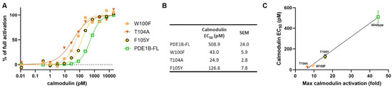 Less calmodulin is needed for activation of PDE1B mutants with reduced activatability. The impact of calmodulin on the activation of full-length PDE1B (PDE1B-FL) and PDE1B-FL with individual mutations that reduce activatability was examined in calmodulin concentration–response experiments in the presence of 50 µM CaCl2. (A) Representative example of calmodulin concentration–response’s impact on activation of the different constructs. (B) Table with average calmodulin activation EC50 and SEM derived from 5 independent experiments. (C) Correlation between maximal calmodulin activation and calmodulin EC50 for the different PDE1B mutants. Simple linear regression coefficient of determination, R2 = 0.98.