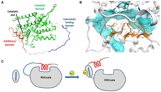 The structure of the inhibitory domain peptide (SDAVPSEVRDWLASTFTQQ) was predicted using PEP-FOLD3 [25]. PyMOL (v3.1.3, Schrödinger, LLC) was used for rendering. The structure of PDE1B1 (Refseq: NM_000924.4) and truncated PDE1B without the terminal regions that are dispensable for activation (amino acids 82–501 of Refseq: NM_000924.4) were predicted using AlphaFold-Multimer AF2.3 [26,27,28]. The top-ranked structure predictions were visualized using MOE (v2024.6, Chemical Computing Group Inc.).